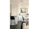Kitchen with white cabinetry, modern cabinets, open shelves, a kitchen bar, and white electric cooktop
