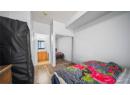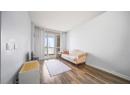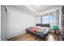 Bedroom with dark wood-style floors, a textured ceiling, and a closet