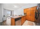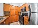 Kitchen with appliances with stainless steel finishes, brown cabinetry, backsplash, light tile patterned floors, and dark countertops