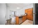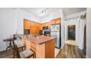 Kitchen featuring a peninsula, stainless steel appliances, dark wood-type flooring, brown cabinets, and a breakfast bar area