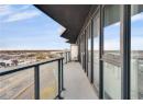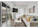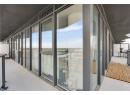 Kitchen with stainless steel appliances, modern cabinets, a wall of windows, dark wood finished floors, and dark brown cabinetry