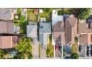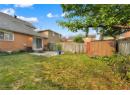 Fenced backyard with a patio area, a storage unit, and a residential view