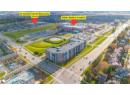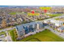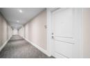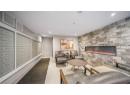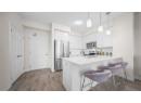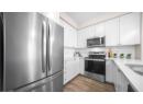 Kitchen with stainless steel appliances, white cabinets, light wood-type flooring, decorative light fixtures, and light stone countertops
