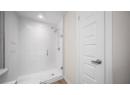 Bathroom featuring vanity, a stall shower, and dark wood-style floors