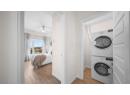 Washroom with light wood finished floors, stacked washer / dryer, and ceiling fan