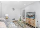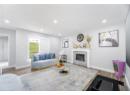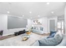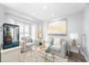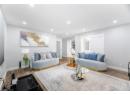 Living room with a fireplace with flush hearth, wood finished floors, baseboards, and recessed lighting