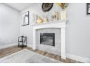 Living room featuring wood finished floors, a tiled fireplace, and baseboards