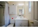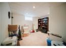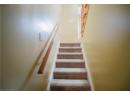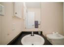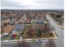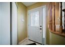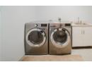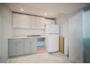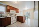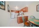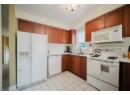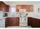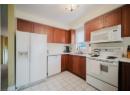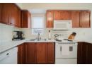 Kitchen with white appliances, light countertops, and wood finish cabinets