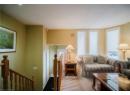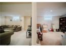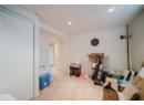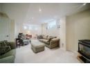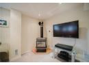 Living room with a wood stove, light colored carpet, and recessed lighting