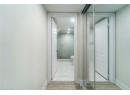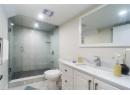 Bathroom with vanity and a marble finish shower