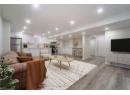 Living room with light wood-type flooring and recessed lighting